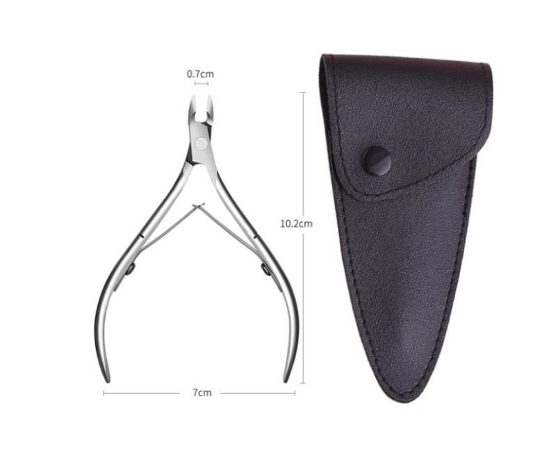 Alicate corta cutícula plateado de acero inoxidable con estuche de protección.
